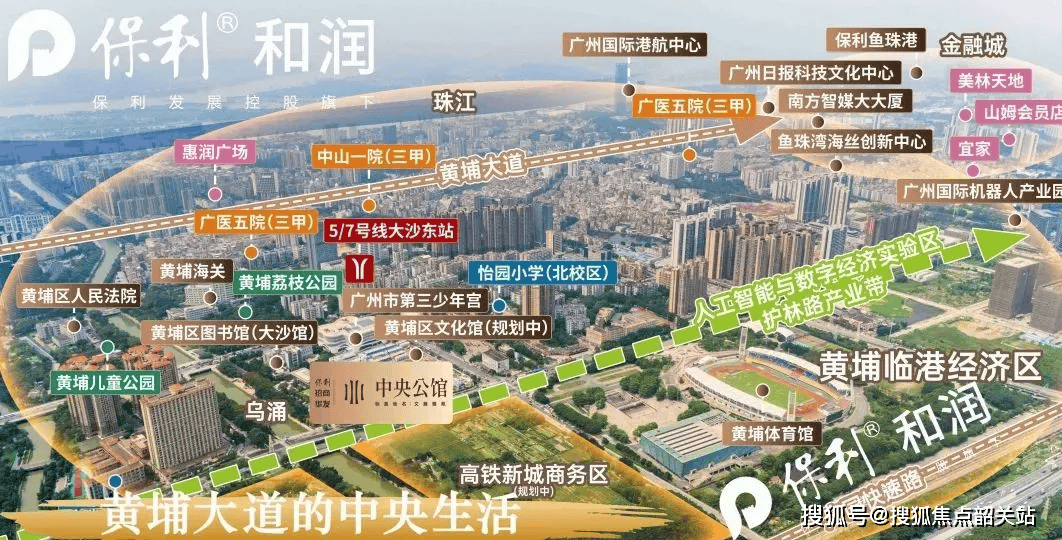 交通方面,项目坐拥“一轴两轨三主干道”的立体交通网络,出行便捷高效。“一轴”即黄埔大道,“两轨”为地铁5号线号线,项目距离双地铁交汇的大沙东站约800米,步行10分钟左右即可抵达。从该站点出发,3站可到达天河金融城,10站约26分钟直达珠江新城,无需换乘;同时,3站可到达黄埔科学城,7站可抵达番禺万博,半小时内可畅达广州各大CBD(珠江新城CBD、琶洲CBD、万博CBD等)。周边还有黄埔大道、中山大道、广园快速三大城市主干道贯穿全城,无论是自驾还是公共交通,都能轻松实现全城通勤。此外,区域未来还有高铁新城的规划,将进一步提升地段价值与交通便利性。