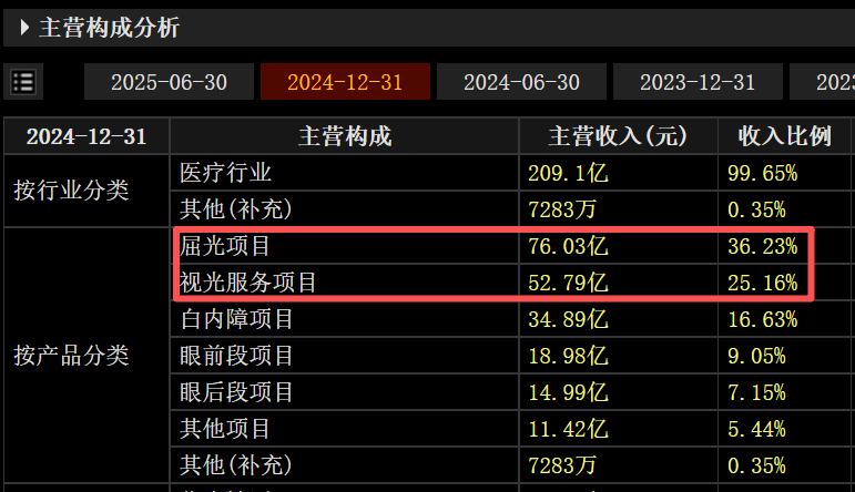 近五年(2020年到2024年),爱尔眼科屈光项目的营业收入分别是43.49亿元、55.2亿元、63.37亿元、74.31元亿和76.03亿元,可以明显看到2020年到2023年该业务的收入尚能保持中低两位数增长,但到了2024年其增速已经变成了低个位数(约2.31%)。2025年三季报,公司没有披露主营收入结构,如果按照屈光项目2023年、2024年36.5%左右的总营收占比测算,增速同样最多是个位数。